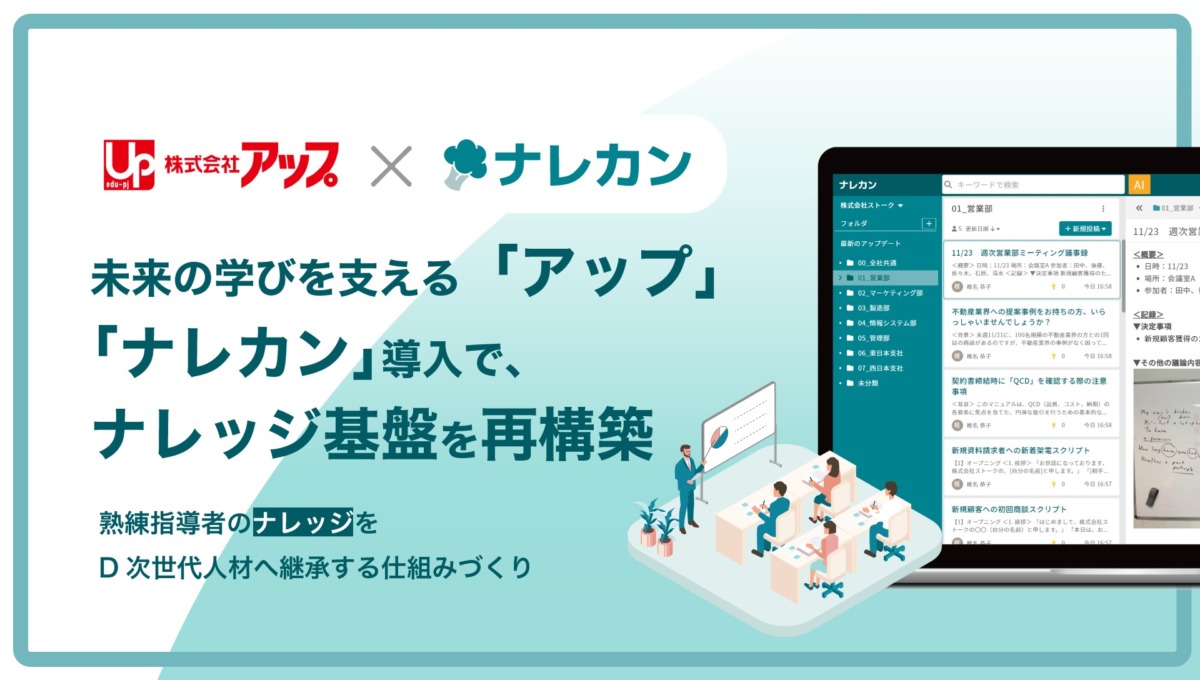 導入から1年経過した現在は、ナレッジの構造化および検索性の向上を実現し、熟達指導者のナレッジを組織全体に共有し活用される環境が整備されつつあります。本プレスリリースでは、アップ様が「ナレカン」の全社導入に至った背景や、導入効果についてを公開しています。