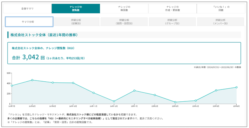 『ナレカン』の運用を最適化していくには、「社内でナレカンが、どの程度活用されているのか」を把握することが重要です。そこで今回、利用状況レポート画面から、KGI(全体サマリ)およびKPI(閲覧数、検索数、作成・更新数、いいね数)をの数値を追えるようにいたしました!