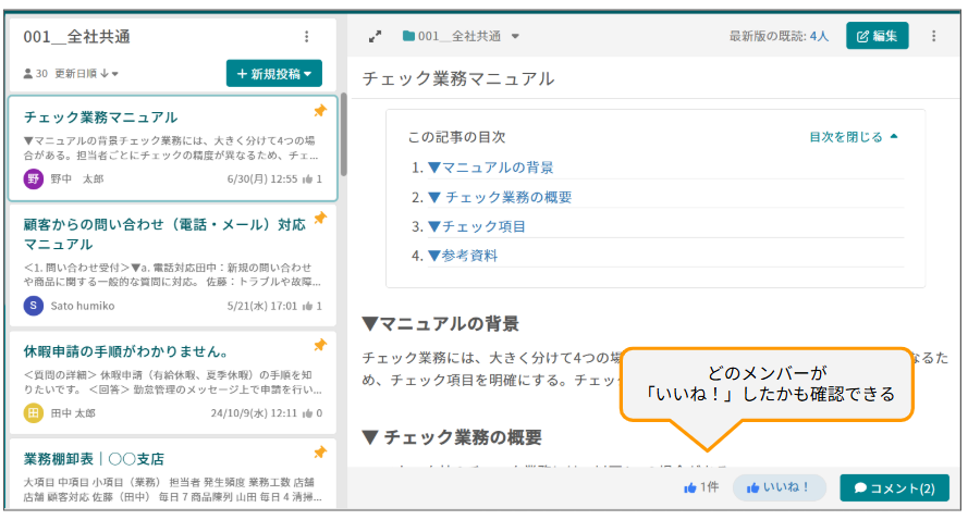 「記事」「質問」に”いいね!”のリアクションが付くことで、ナレッジの提供者はメンバーからの評価・称賛を実感しやすくなり、ナレッジ蓄積のモチベーション維持につながります。