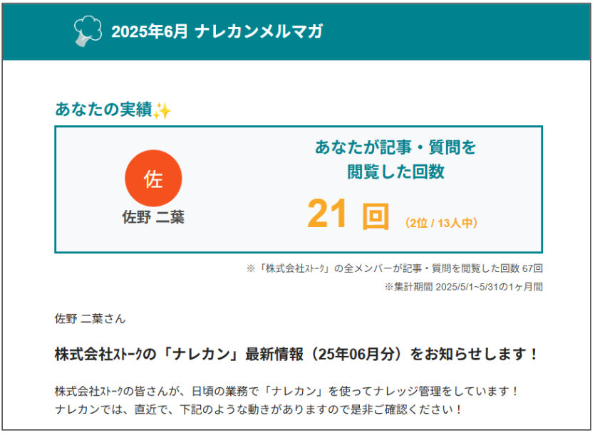 この度、ナレッジ管理ツール「ナレカン」に【社内メルマガ機能】を実装いたしました!これにより、月初めに、ナレカンを利用する各ユーザ様宛に、前月分のナレカンの利用状況がまとめられたメルマガが届くようになります。