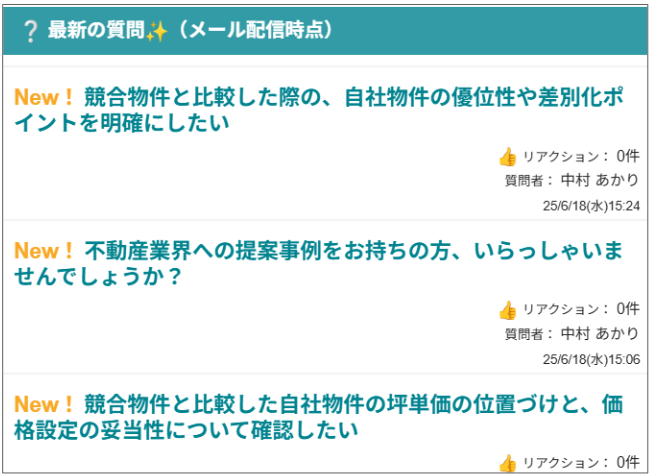 ほかにも、「重要なお知らせ」「記事質問ランキング」「メンバーランキング」「最新の質問回答」も一覧で把握可能です。そのため、自分だけでなく、チーム全体がどのくらいナレカンを活発に利用しているかも、メルマガからご確認いただけます。