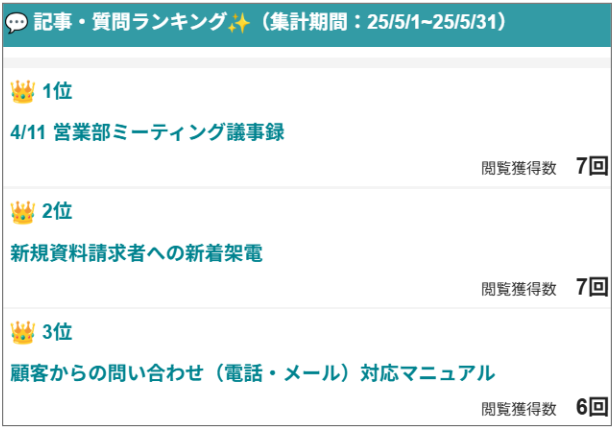 ほかにも、「重要なお知らせ」「記事質問ランキング」「メンバーランキング」「最新の質問回答」も一覧で把握可能です。そのため、自分だけでなく、チーム全体がどのくらいナレカンを活発に利用しているかも、メルマガからご確認いただけます。